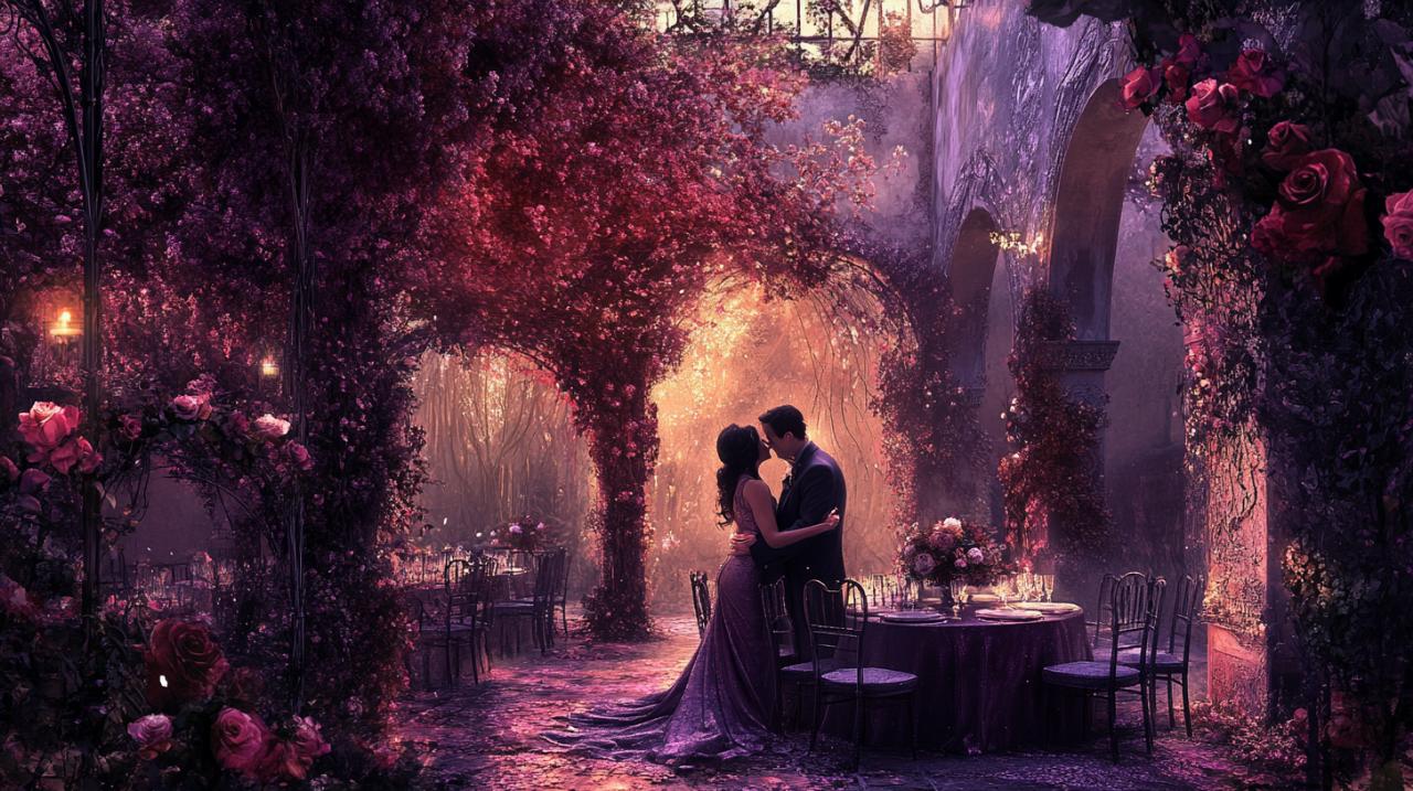 La célébration des noces de porphyre mérite une mise en scène à la hauteur de leur rareté. L'ambiance visuelle de la réception doit s'articuler autour de la palette chromatique caractéristique : pourpre, violet profond, rouge grenat, avec des touches d'or pour évoquer la préciosité de l'événement. Le choix du lieu revêt une importance particulière, avec des options variées selon les préférences du couple. Un château historique dont les pierres anciennes dialoguent avec la symbolique de durabilité du porphyre offre un cadre majestueux, tandis qu'un domaine viticole permet de combiner l'élégance naturelle des vignobles avec des dégustations œnologiques qui célèbrent les vins aux reflets pourpres. Pour les amoureux de la nature, une salle en bord de mer au coucher du soleil, lorsque le ciel se pare de teintes violettes et roses, crée une atmosphère romantique inoubliable.